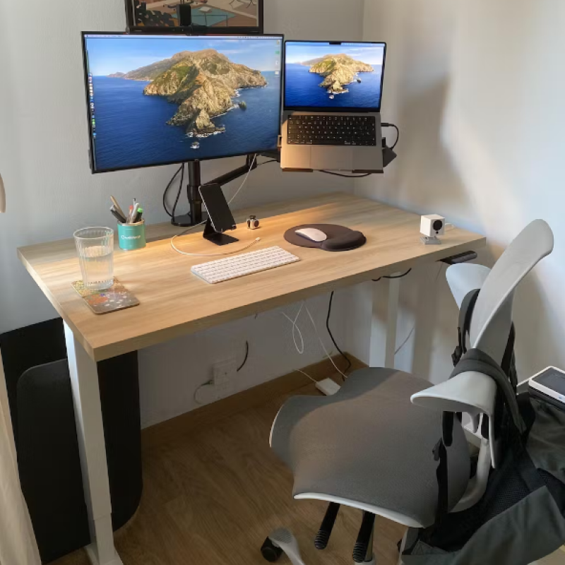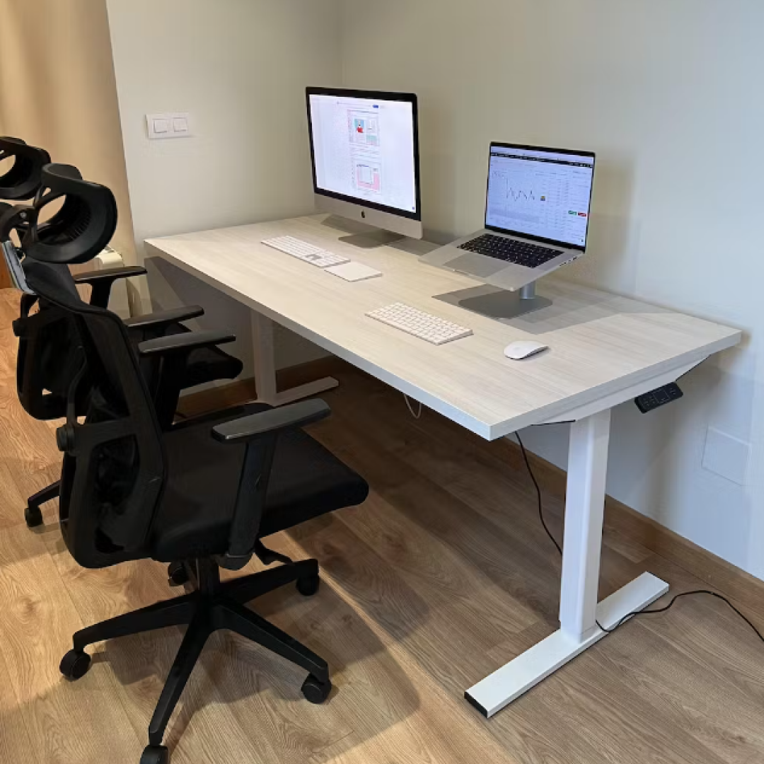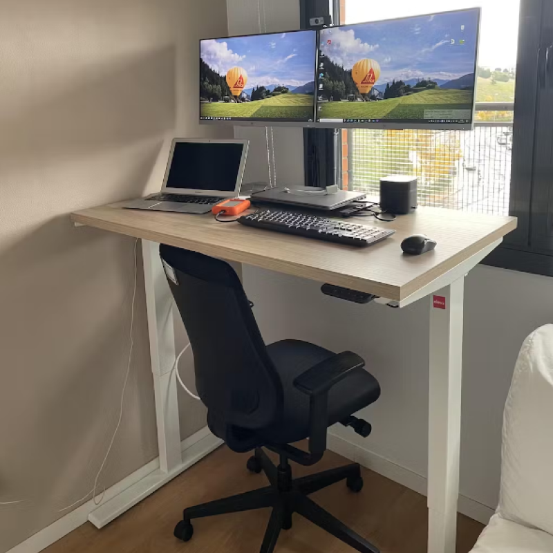 He adquirido el escritorio Eleva 3.0 y, después de dos semanas de uso, estoy encantado con la compra. El tablero se nota de gran calidad, con un grosor espectacular, y con el tamaño de 120x80 es más que suficiente para un portatil y dos pantallas, y poder trabajar bien. La estructura genial, también es de gran calidad, apenas hace ruido al subir y bajar, buena velocidad, y lo que más me ha sorprendido es la estabilidad que tiene arriba. En la posición de pie se puede escribir y usar el teclado sin que baile la mesa. Una gran compra.