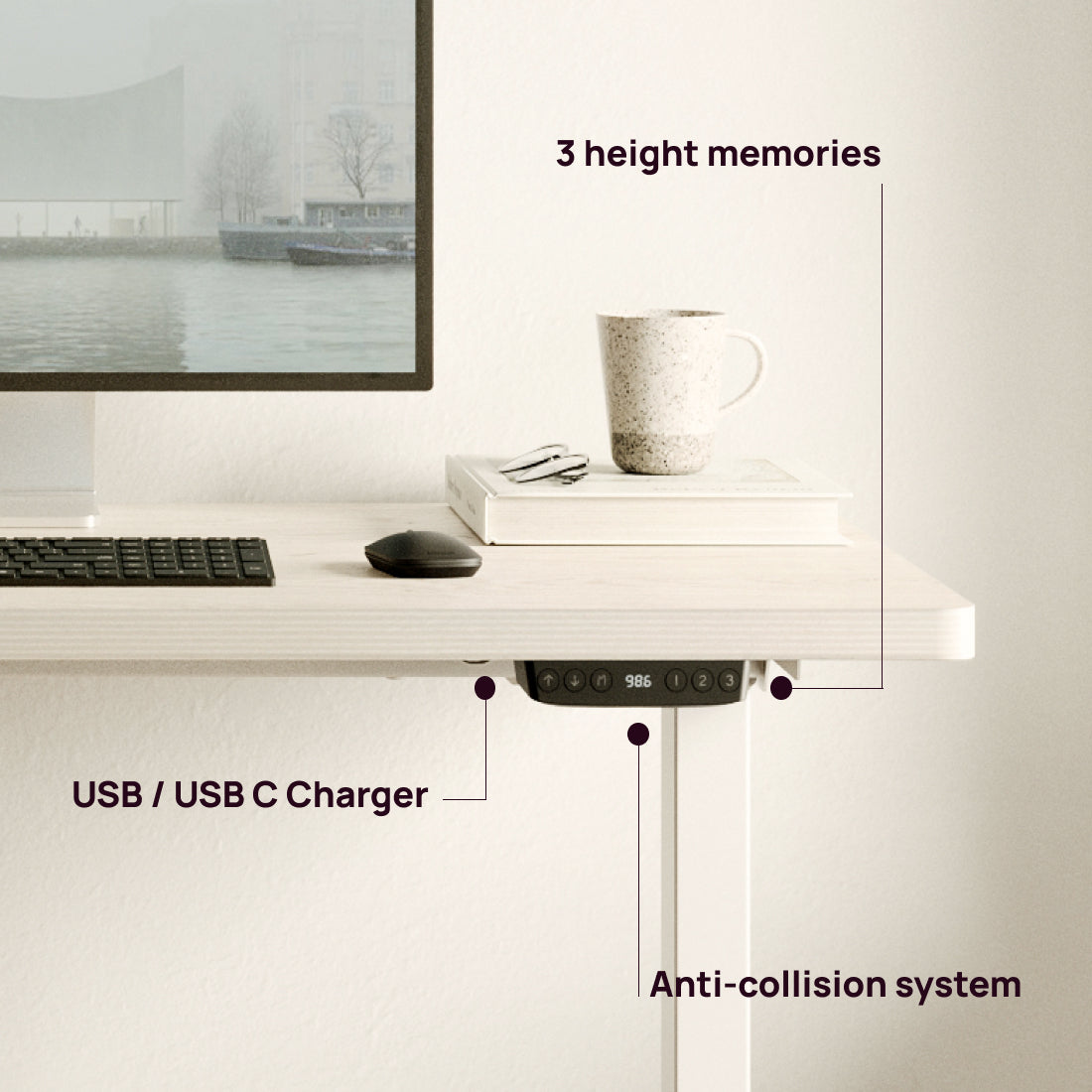 Enfin, Eleva Pro est notre modèle haut de gamme. Un bureau avec 2 moteurs et une capacité de charge de 100 kg qui supporte de grandes planches, jusqu'à 2 mètres de long. Il a une plage de hauteur plus large qui va de 720 mm à 1 210 mm. Sa vitesse de levage est de 38 mm/s. Il dispose de 4 mémoires de hauteur et d'un système anti-collision.
